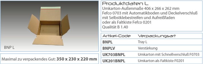 Contemporaneamente, l'addetto può montare il cartone di spedizione o preparare i documenti di spedizione. Subito dopo, il vassoio è avvolto e pronto per essere inserito nel cartone di spedizione. Con questo sistema di macchine, tutto è un gioco da ragazzi e perfettamente imballato. I costi sono sempre gli stessi e sono inclusi nel prezzo del vassoio. Il sistema macchina vi viene fornito, pellicola inclusa. Non ci sono fluttuazioni dovute a una maggiore o minore quantità di materiale di riempimento. La spedizione di merci fino a 10 kg di peso non è un problema. Grazie a scatole esterne e rinforzi perfettamente progettati, la spedizione è rapida e sicura.