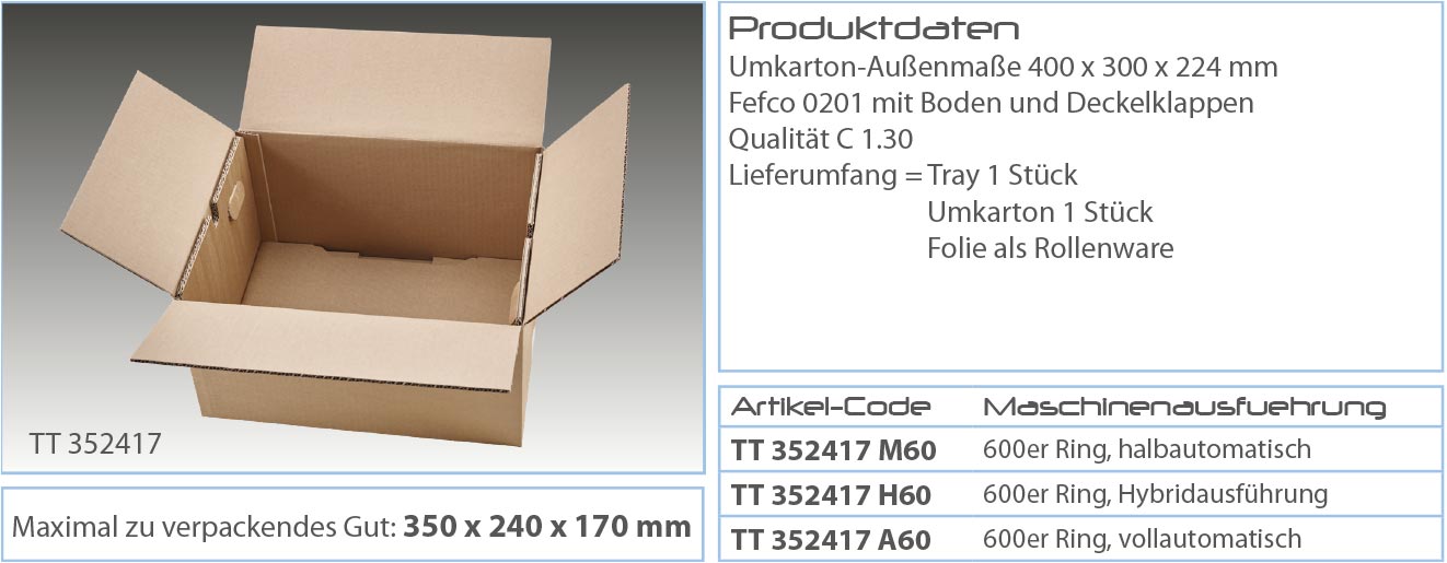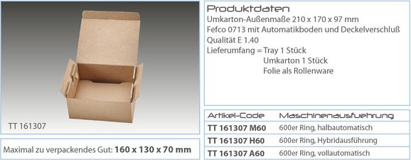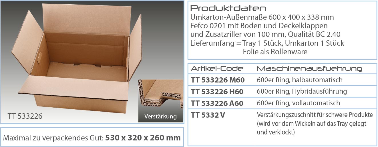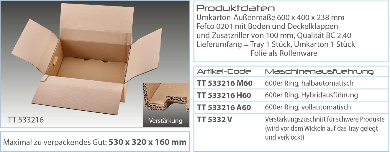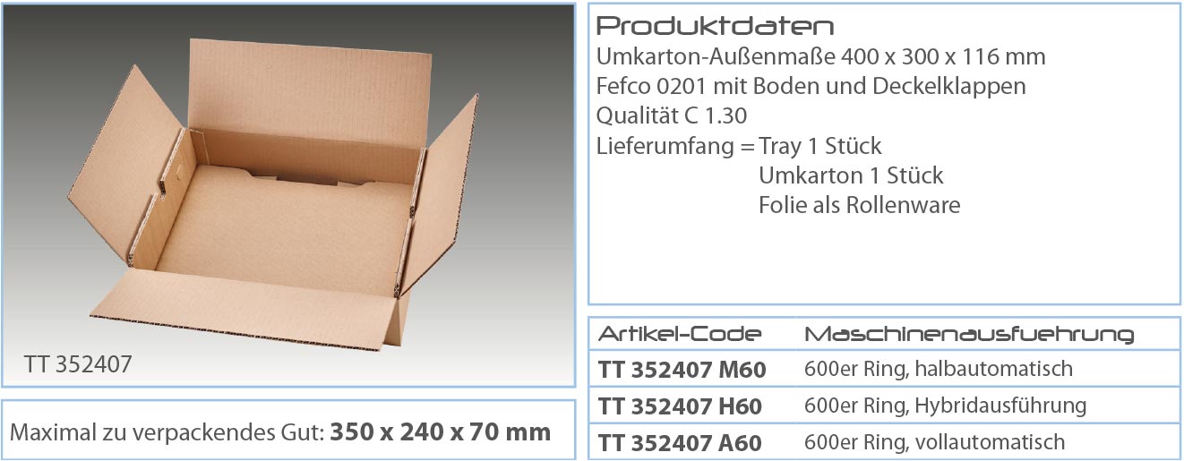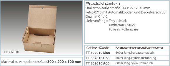 Diese Tray-Verpackungsmaschine garantiert Ihnen perfekten Produktschutz, schnelles Verpacken und niedrige Kosten. Es ermöglicht Ihnen zudem maximale Flexibilität für Klein- und Großserien verschiedenster Produkte. Der Verpackungsprozess bleibt stets der Gleiche, auch bei chaotisch wechselnden Packstücken mit unterschiedlichsten Produkthöhen und Gewichten bis 160 kg. Und das Beste : Sie sparen verschiedene Verpackungsgrößen, Lagerplatz und Zeit. Füll- und Polsterstoffe werden nicht mehr benötigt.