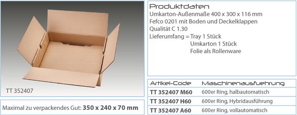 Das Packstück wird auf ein definiertes Tray platziert. Dabei ist es egal welche Konturen, Abmessungen oder Höhen das Packstück hat. Wichtig ist nur, dass es innerhalb des vorgesehenen Volumens für den Versandkarton Platz findet. Durch den Einzug wird das Tray samt Packstück vertikal mit spezieller Stretchfolie umwickelt. Fest fixiert auf dem Wellpapp-Tray wird das Packstück im Karton sicher versendet.